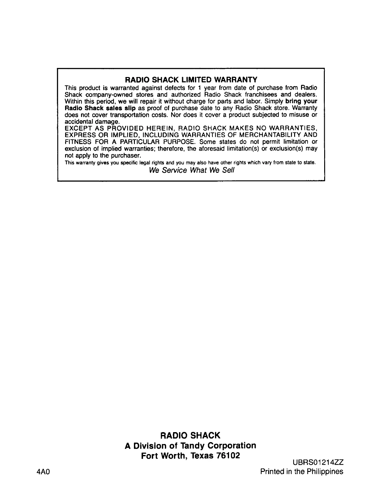 Realistic Pro-2025 - Radio Shack Limited Warranty