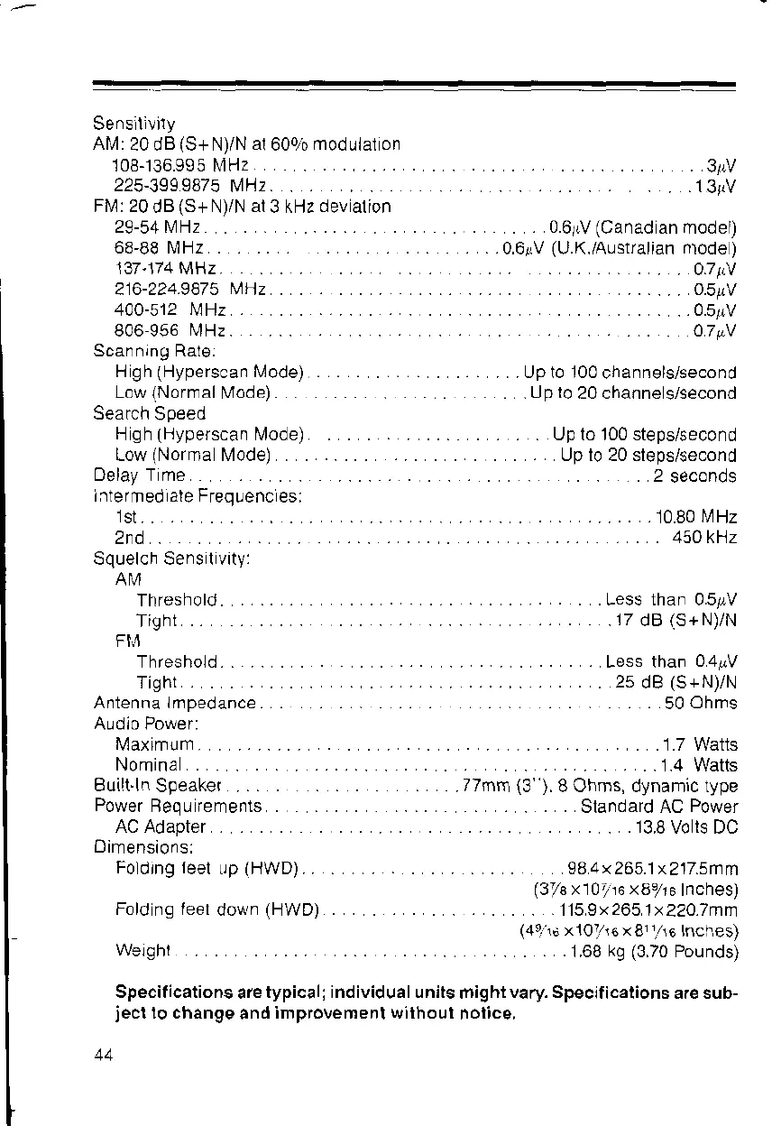 Realistic PRO-2036 - Detailed Scanner Specifications; Sensitivity and Scanning Rates; Audio, Power, and Dimensions