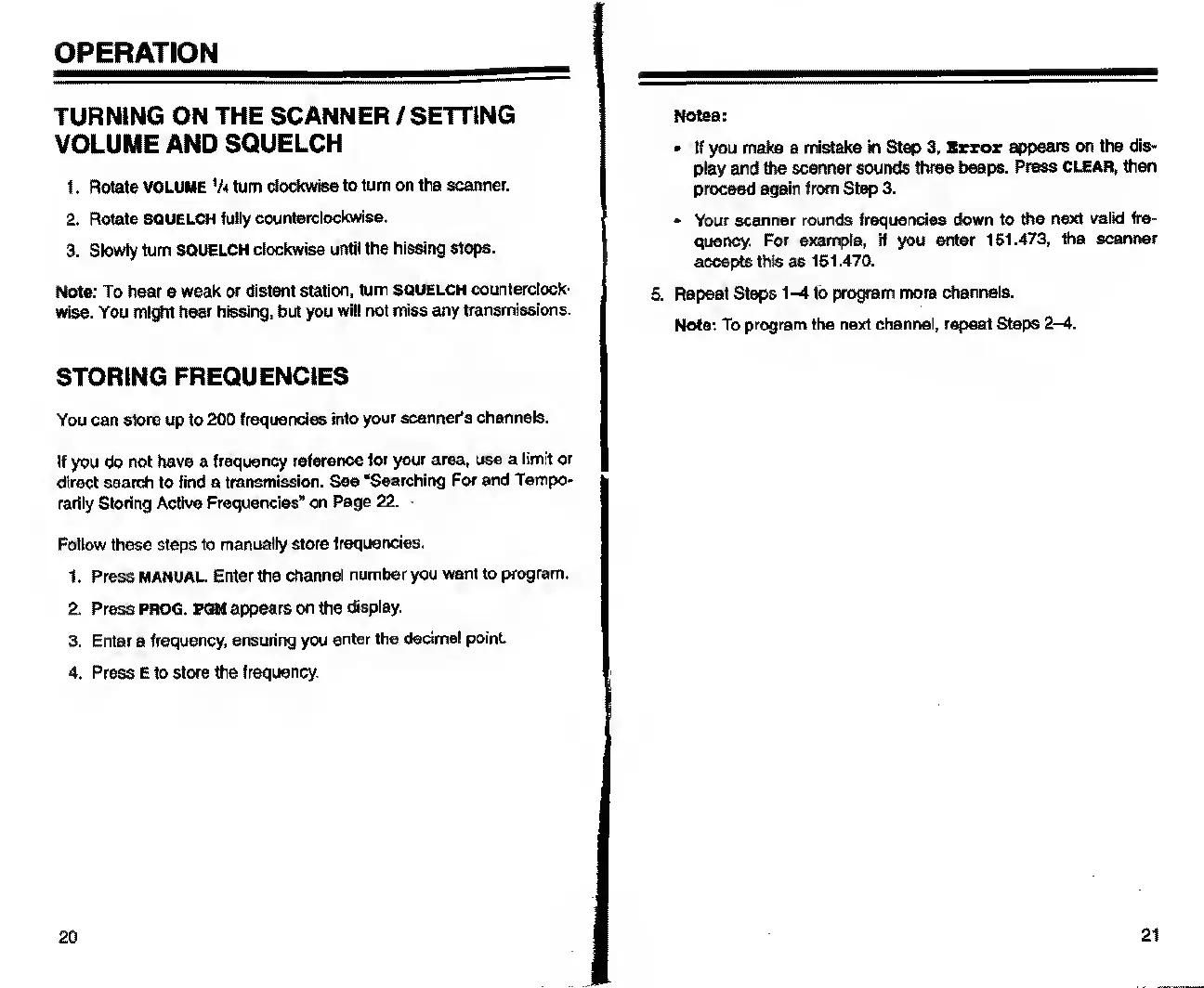 Realistic PRO-26 - Operation.20; Turning on the Scanner; Setting Volume and Squelch.20; Storing Frequencies.20