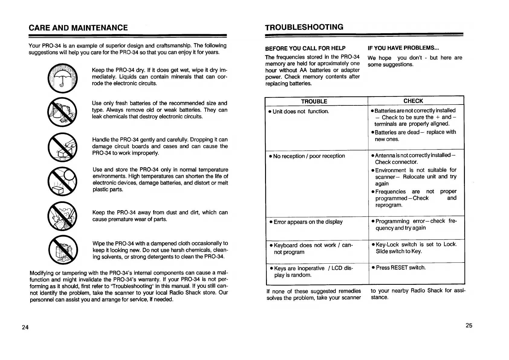 Realistic PRO-34 - CARE AND MAINTENANCE; TROUBLESHOOTING