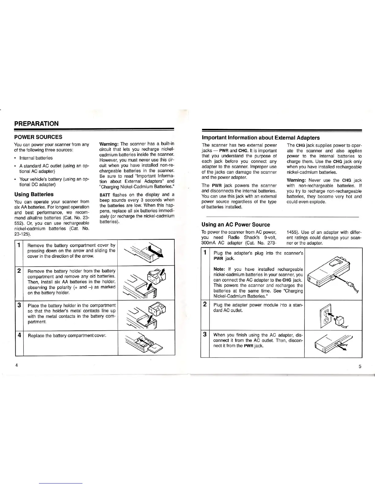 Realistic PRO-37 - PREPARATION; POWER SOURCES; Important Information about External Adapters