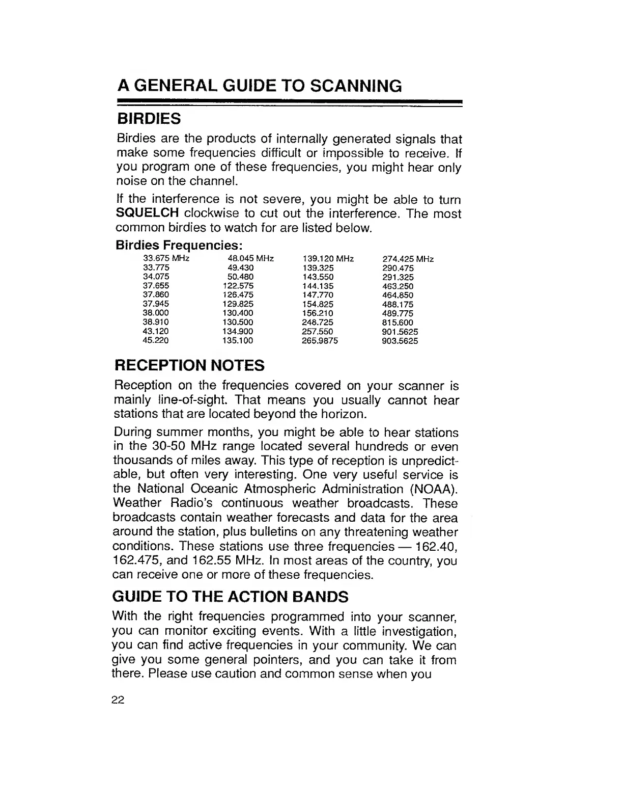 Realistic PRO-43 - A General Guide to Scanning.22; Birdies.22; Reception Notes.22; Guide to the Action Bands.22