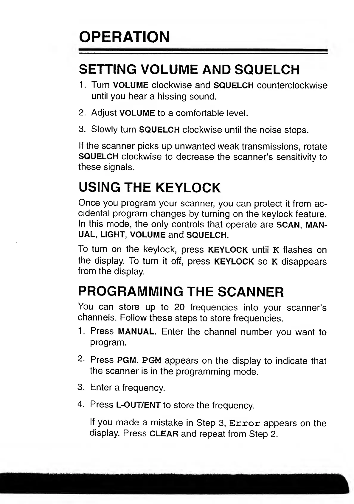Realistic PRO-50 - Operation; Setting Volume and Squelch; Using the Keylock; Programming the Scanner