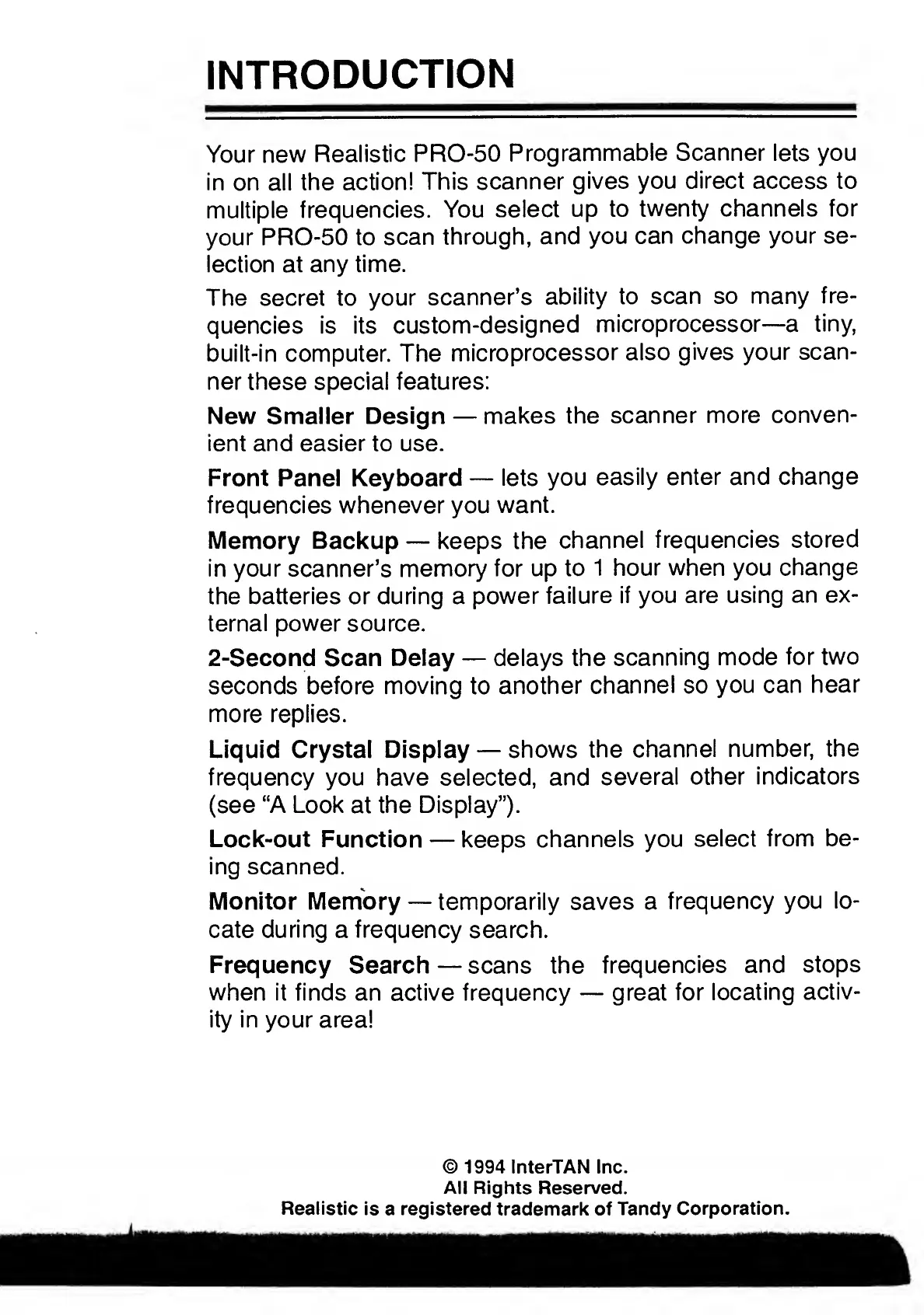 Realistic PRO-50 - Introduction; New Smaller Design; Front Panel Keyboard; Memory Backup