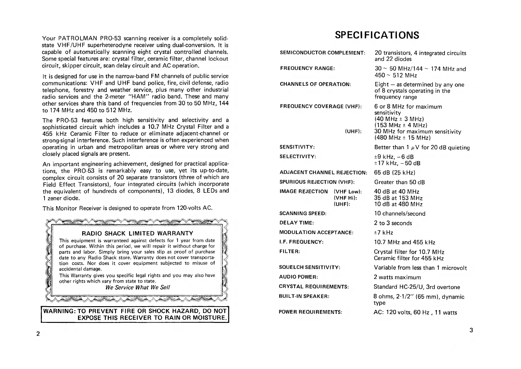 Realistic Pro-53 - Specifications; Semiconductor Complement; Frequency Range; Frequency Coverage (VHF)
