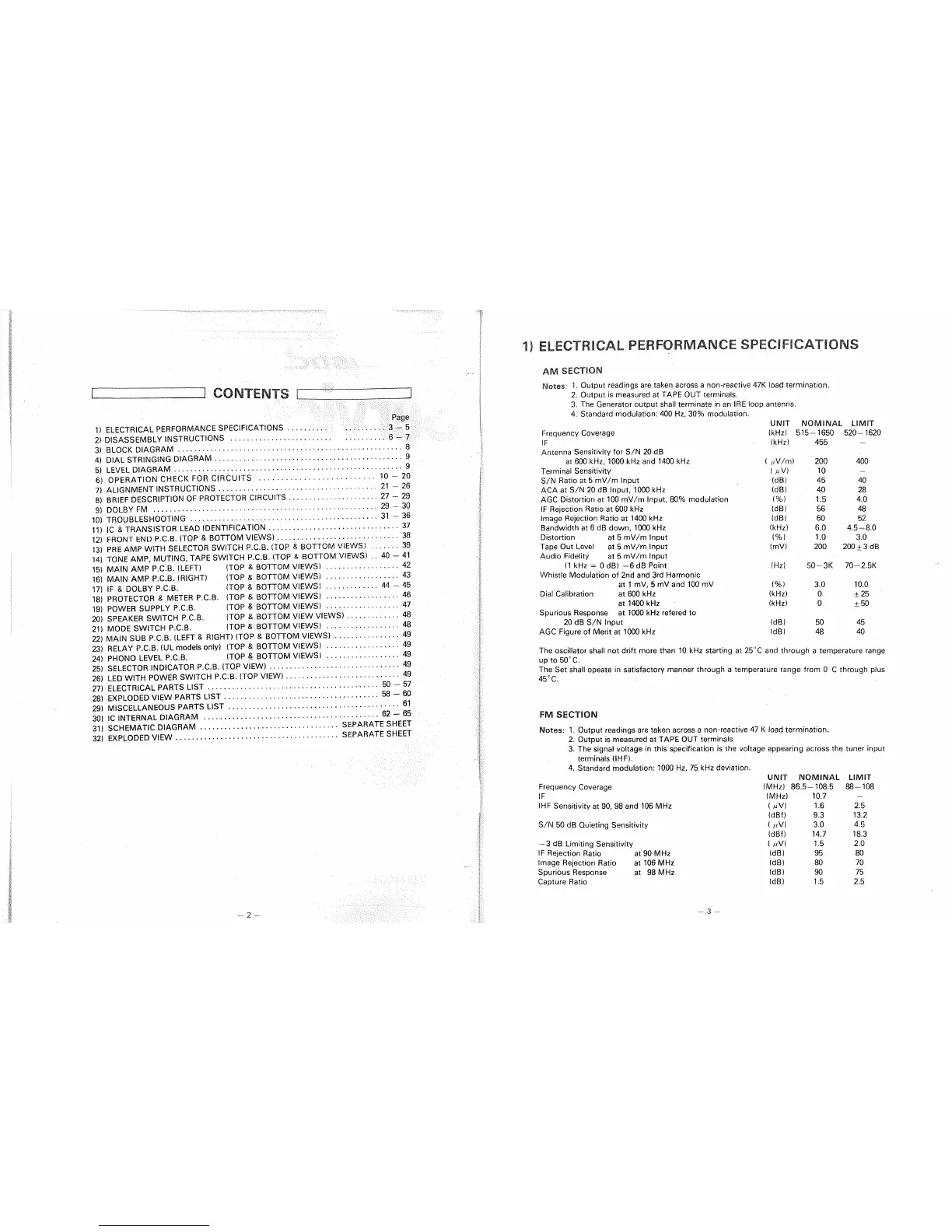 Realistic STA-2100D - Contents; Electrical Performance Specifications; AM Section; FM Section