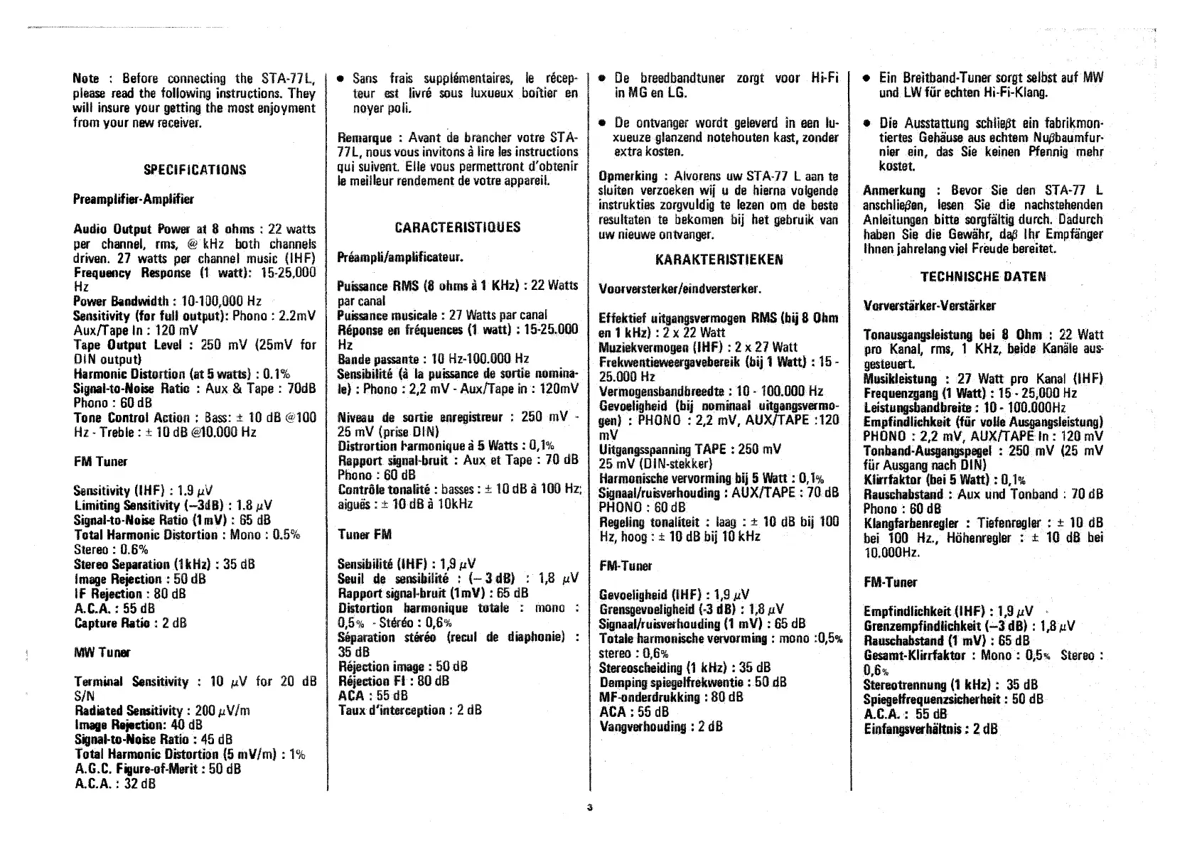 Realistic STA-77L - Specifications; Preamplifier-Amplifier; FM Tuner; MW Tuner