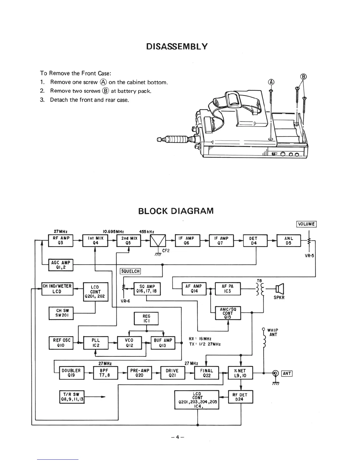 Realistic TRC-216 - Disassembly; Front Case Removal; Block Diagram