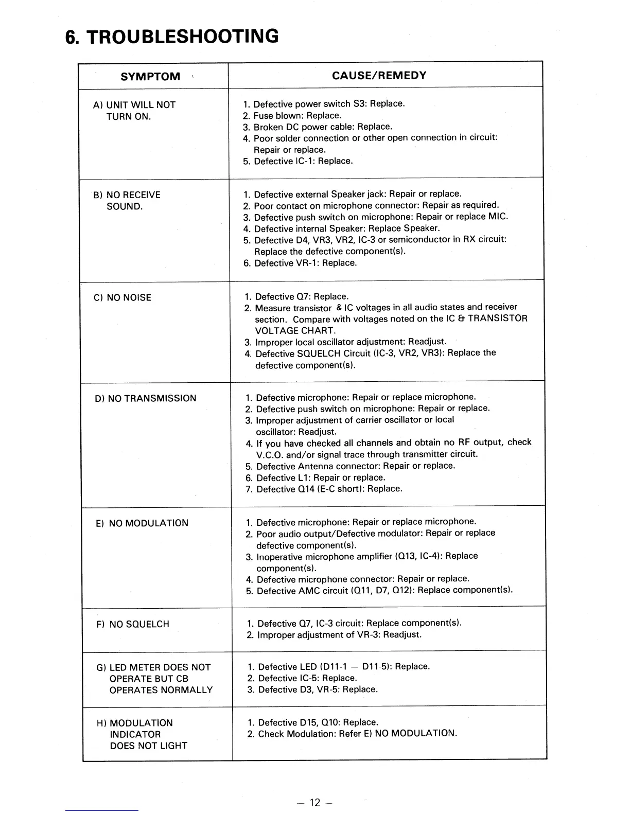 Defective SQUELCH Circuit (IC-3, VR2, VR3): Replace the