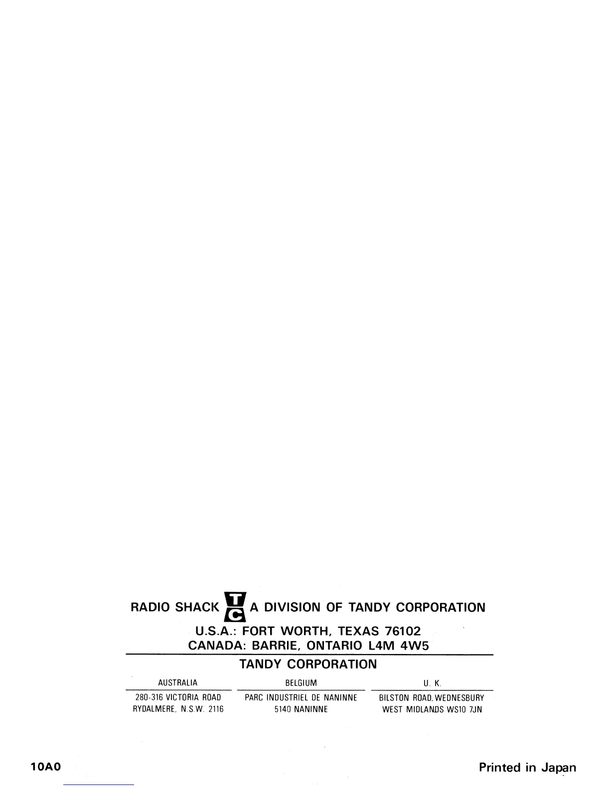 RADIO SHACK M A DIVISION OF TANDY CORPORATION