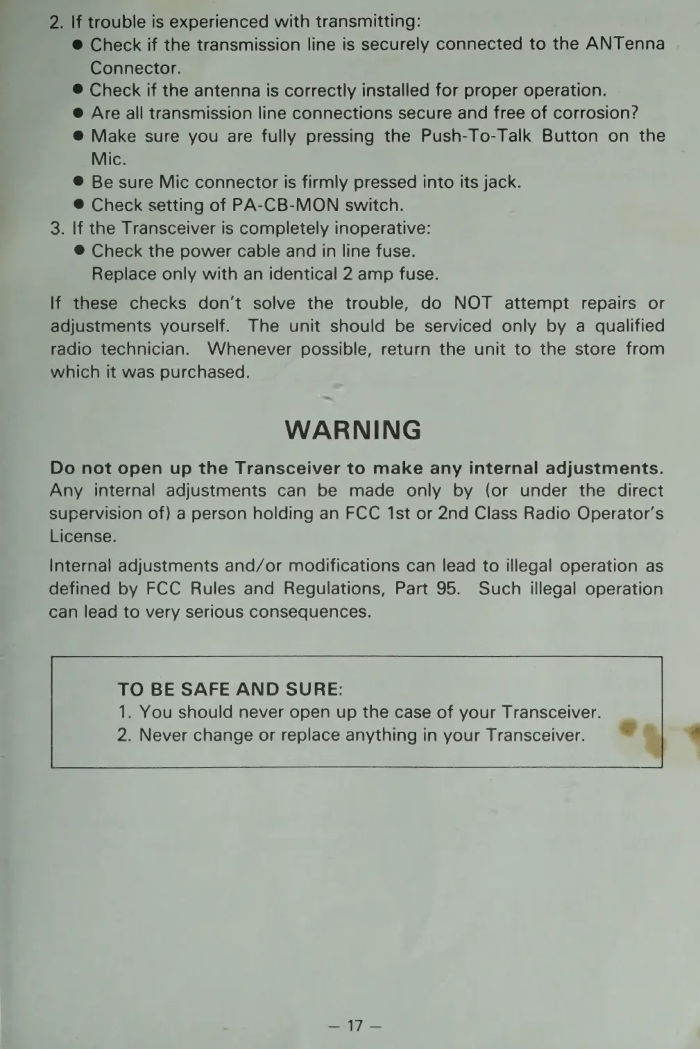 Realistic TRC-422A - Safety Warnings and Service; Transceiver Inoperability Checks; Safety Precautions and Servicing