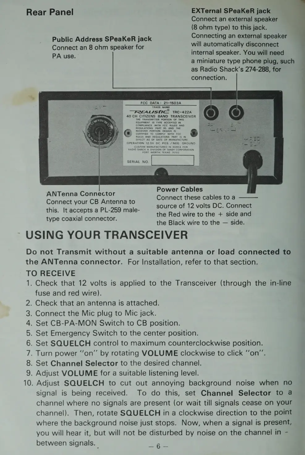 Realistic TRC-422A - Rear Panel and Connections; External Jacks and Connections; Using Your Transceiver; Receiving Operation Guide