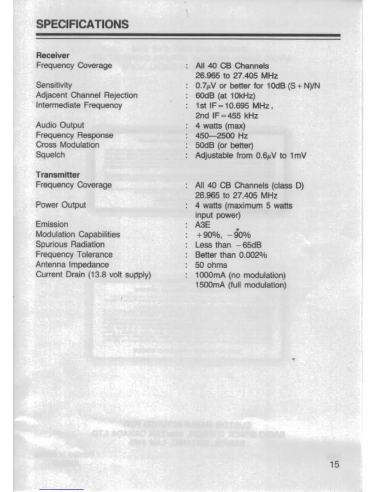 Realistic TRC-430 - Specifications; Receiver Specifications; Transmitter Specifications