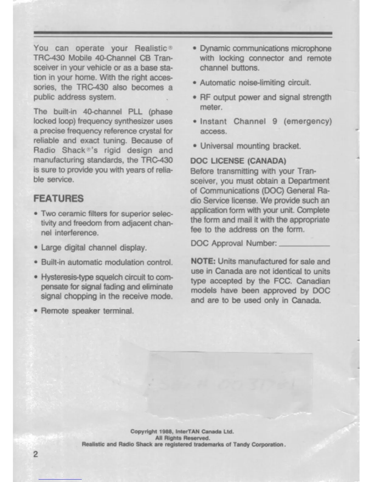 Realistic TRC-430 - Features