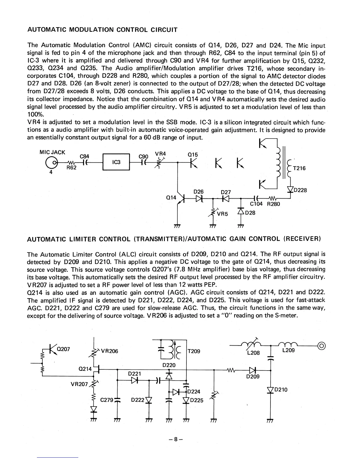 The Automatic Limiter Control (ALC) circuit consists of D209, D210 and Q214. The RF output signal is