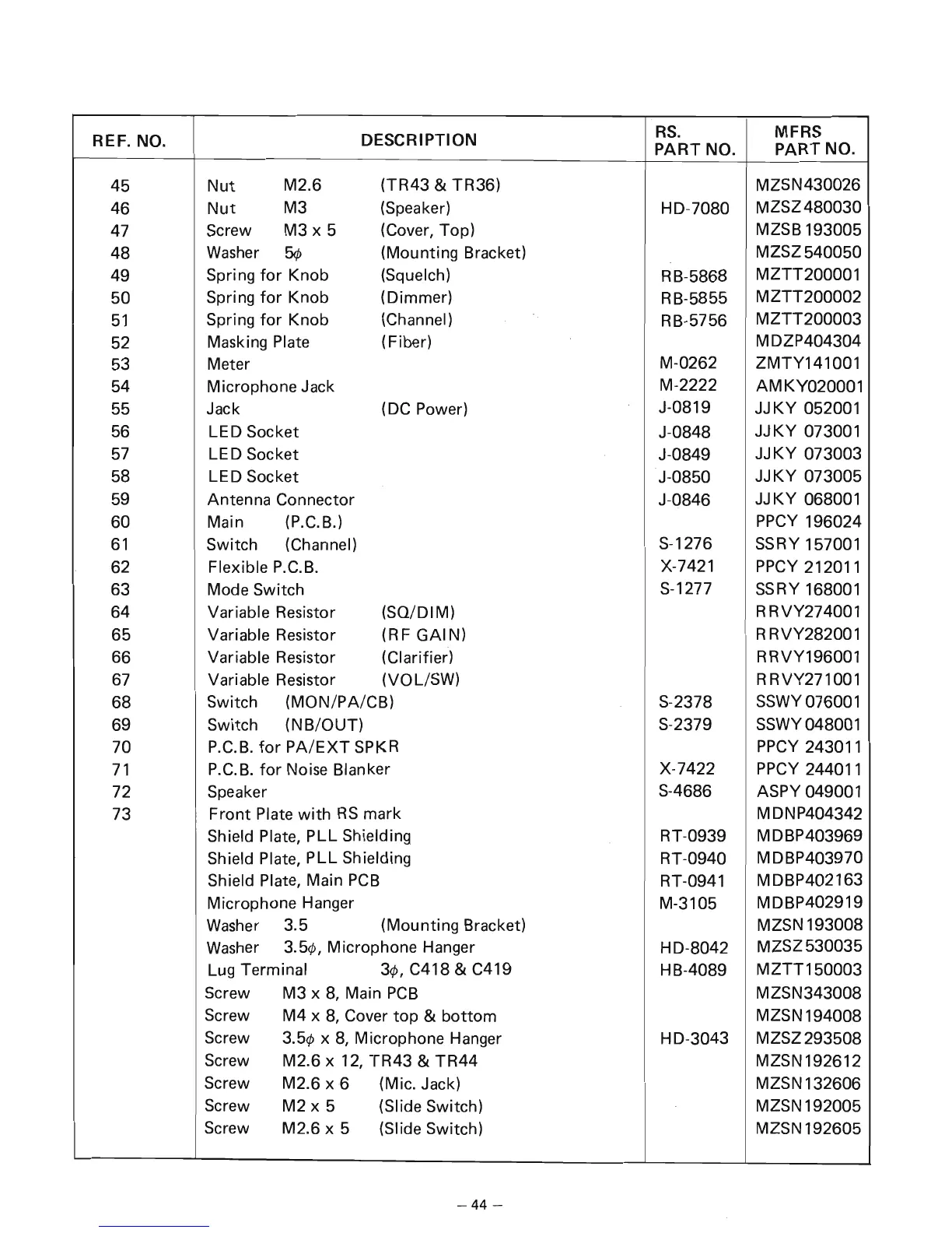 Realistic TRC-449 - Mechanical Assembly Details; Assorted Nuts and Springs; Meters, Jacks, and Connectors; Switches and Variable Resistors