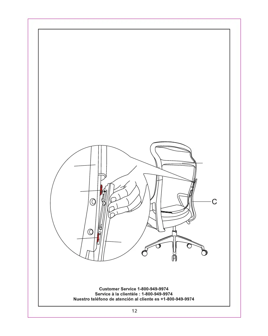 positioning pin of the backrest (A) into the slot of the right armrest (C). Pay