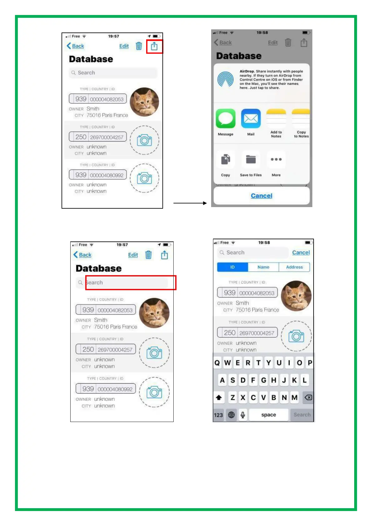 Carrying out a search in the database can be done by "Chip" ID or by name or by address.