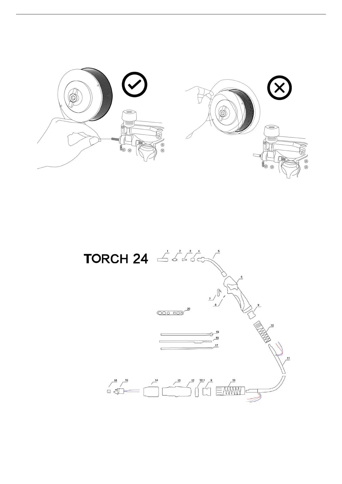 reel, pay attention to pinch the welding wire with your right hand to avoid the wire bounce.