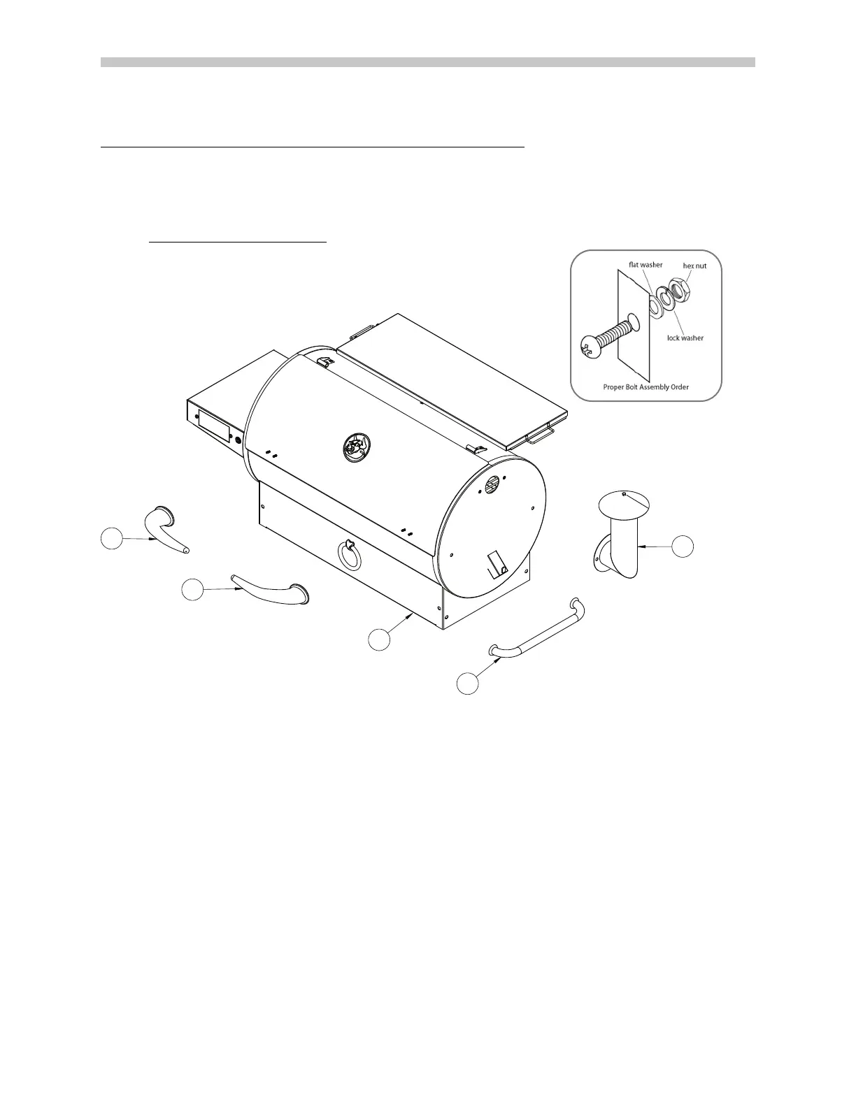 Attach bull horn handles 6 and 7 to grill body using 4 small bolts (M6 x 16). (See Bolt Assembly