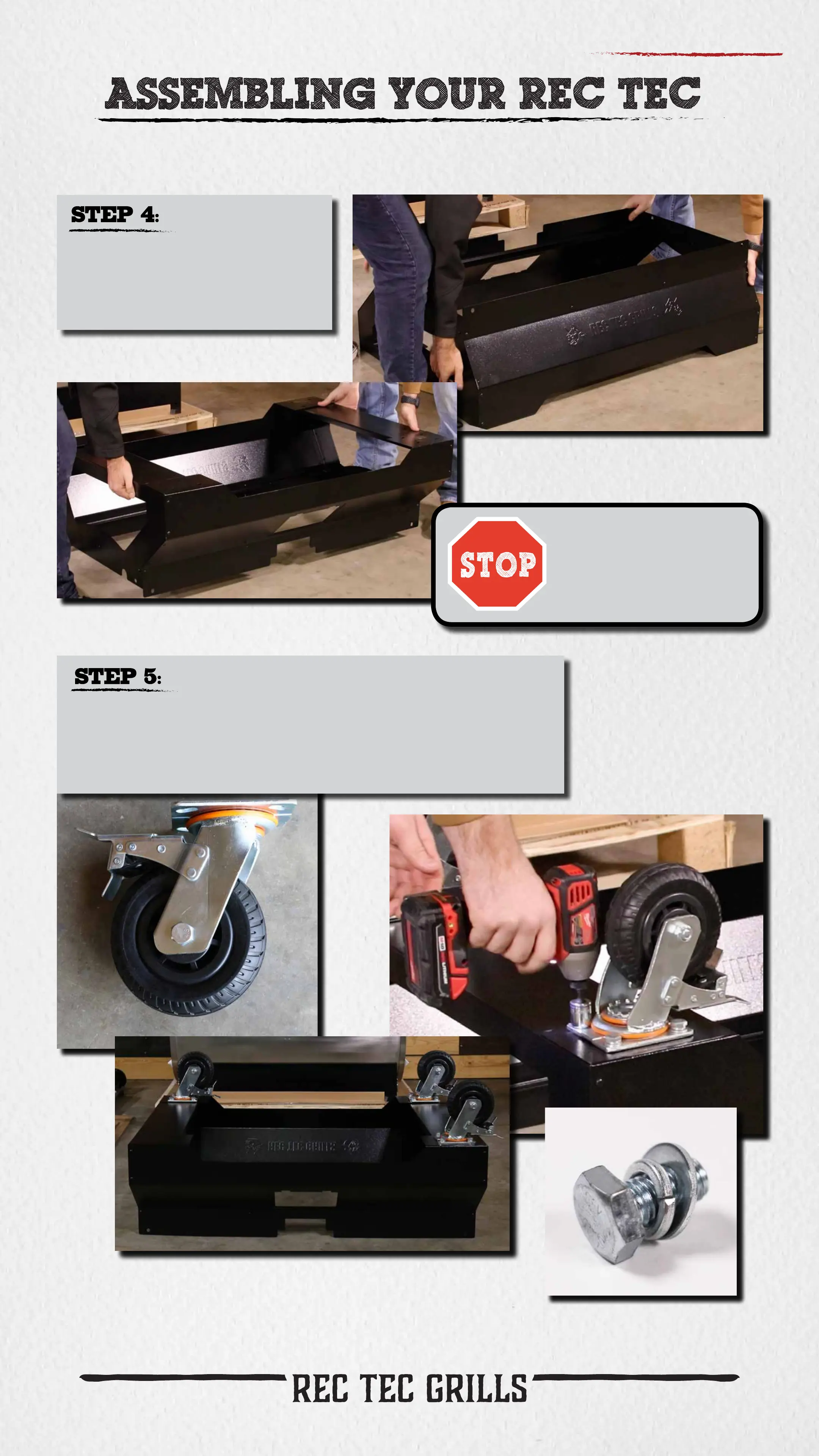 Attach all 4 locking caster wheels (#17) using 16 hex