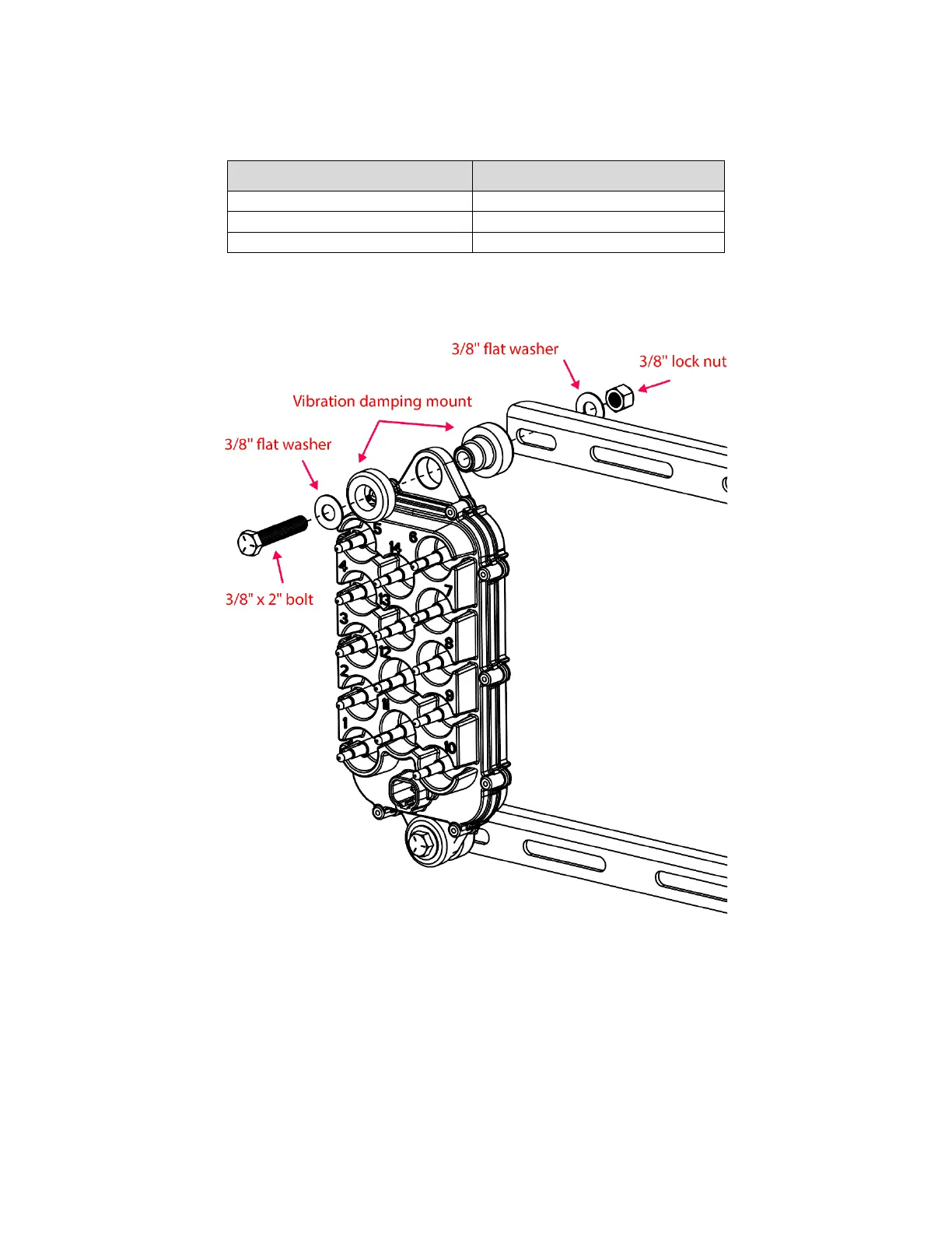 4. Use 3/8” x 1” bolts (356060-000400), washers (352012-000031), and locknuts (352011-