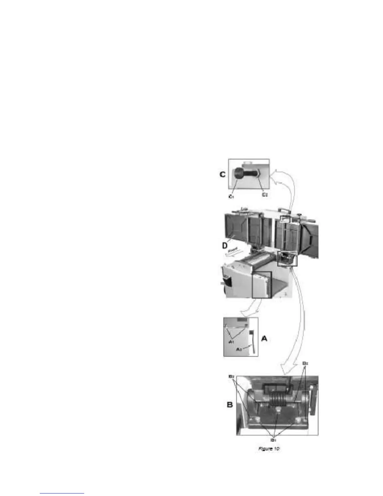 3. Raise the table (D) fully upright. Adjustment is performed by means of four setscrews (B2) that