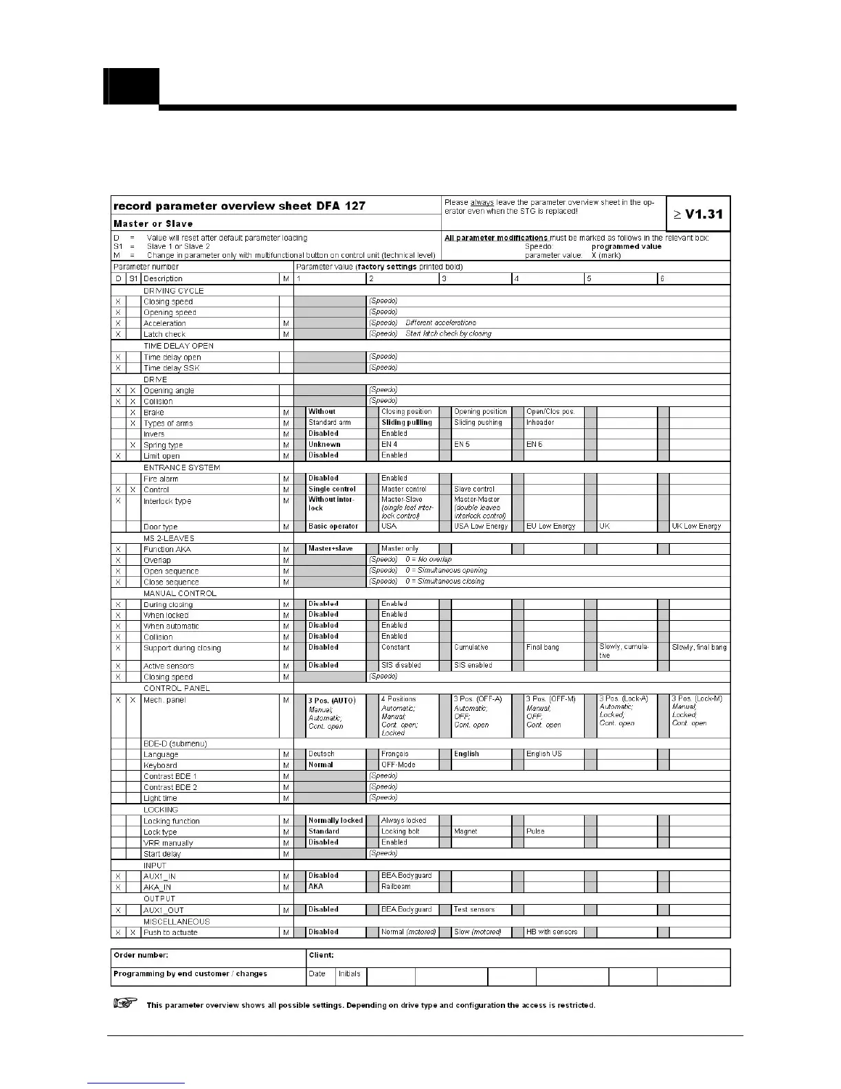 15.1 Parameter Overview Factory settings: Basic operator (Full Power)