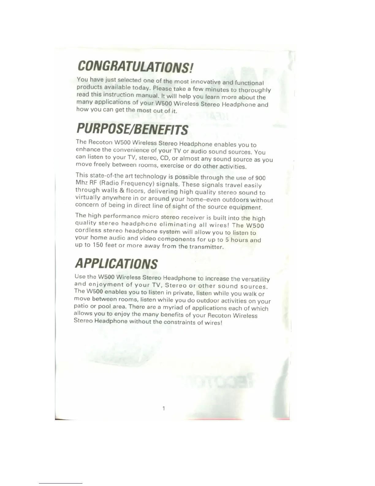 Recoton W500 - Purpose and Benefits of Recoton W500; Applications of the Wireless Stereo Headphone