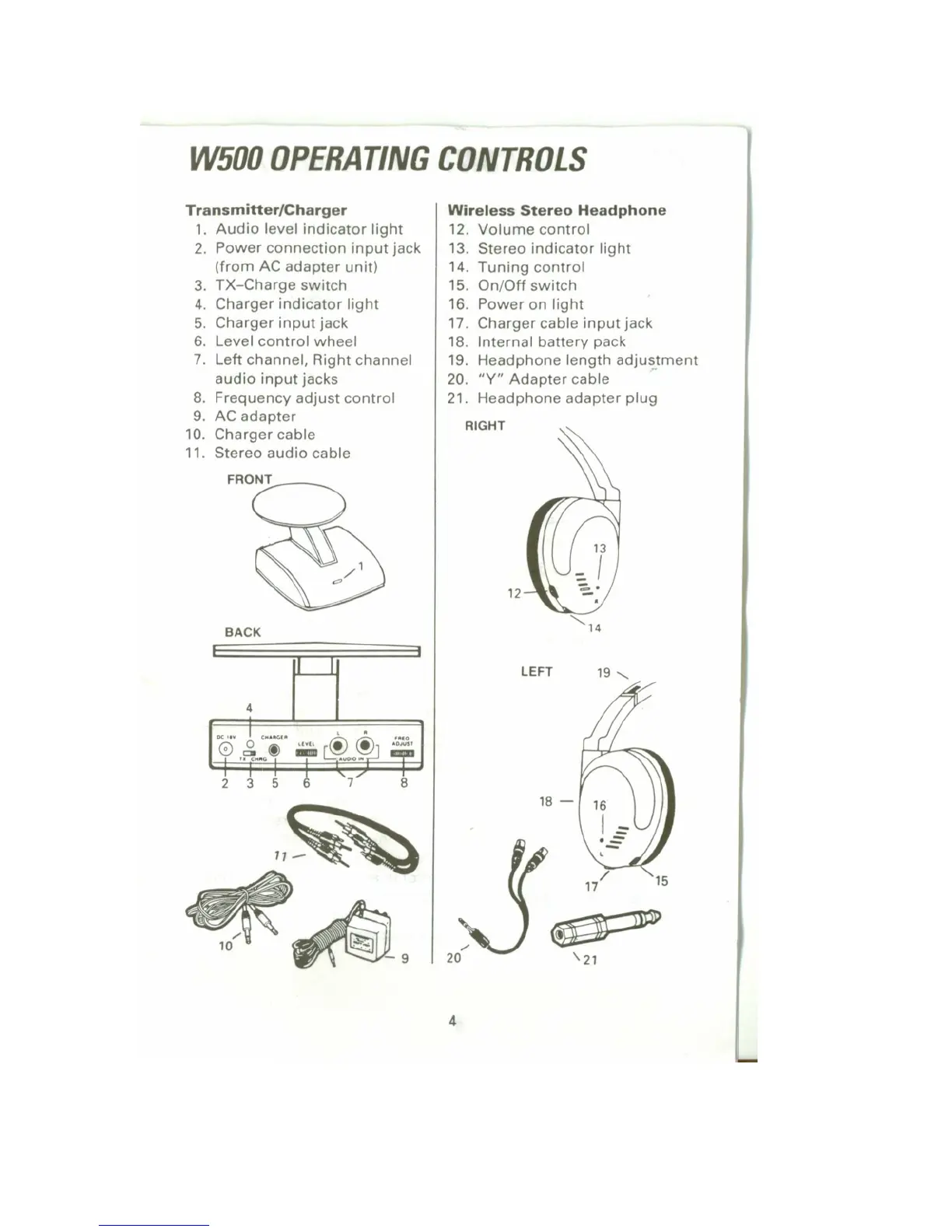 Recoton W500 - W500 Operating Controls; Transmitter;Charger Controls Overview; Wireless Stereo Headphone Controls Overview