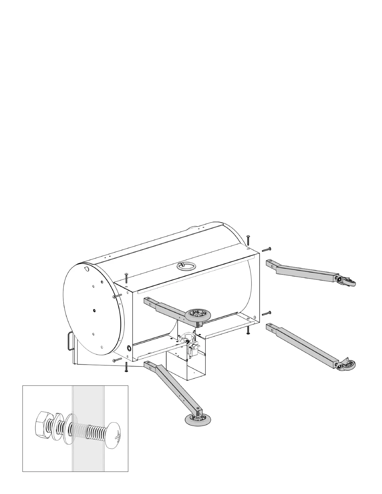 Then on the right side, attach caster wheel legs (2) with bracket holes facing outward from the grill.