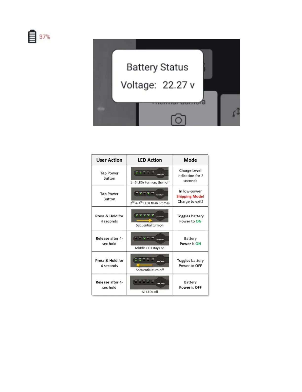 This table summarizes user actions, the various resulting battery states, and LED