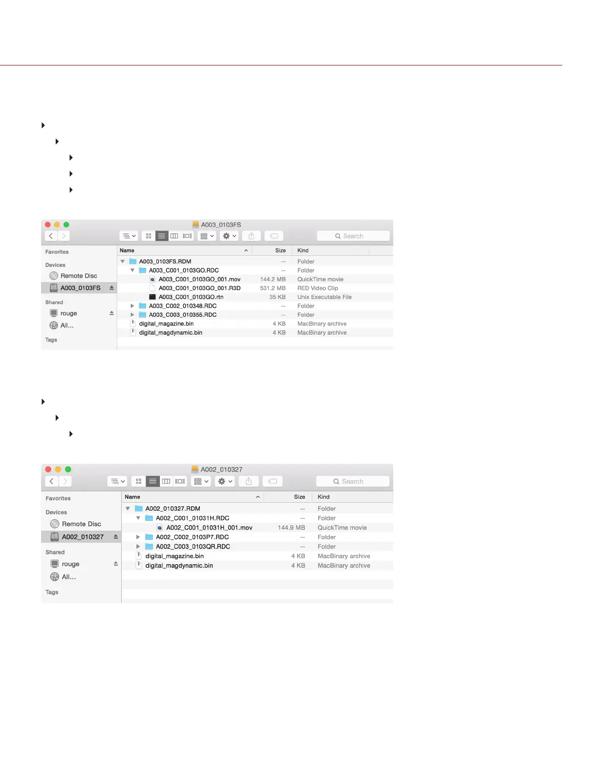 When recording REDCODE RAW + QuickTime, this is the file structure of the recorded files on the RED MINI-MAG: