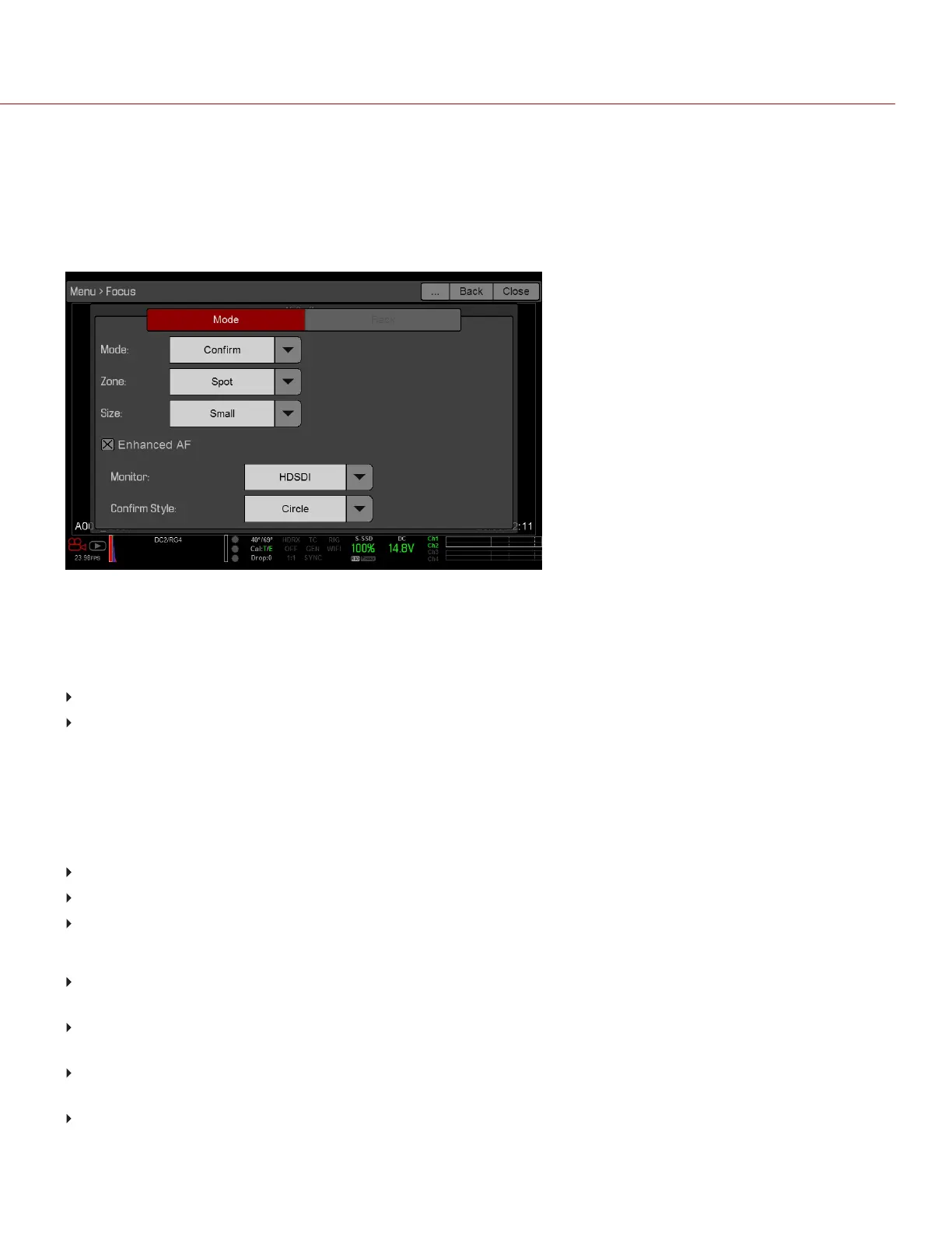 Confirm: Enables the Center or Spot focus target. This mode provides additional focus assistance by using red,