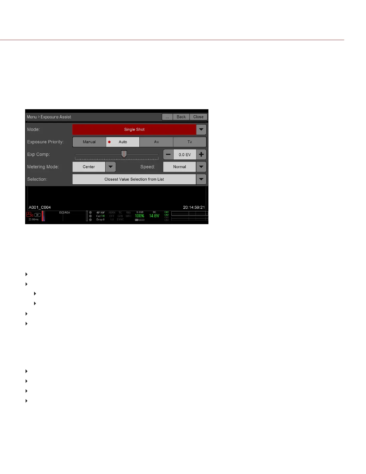 The Exposure Assist menu provides access to settings for the Auto Exposure (AE) feature. The AE feature maintains a