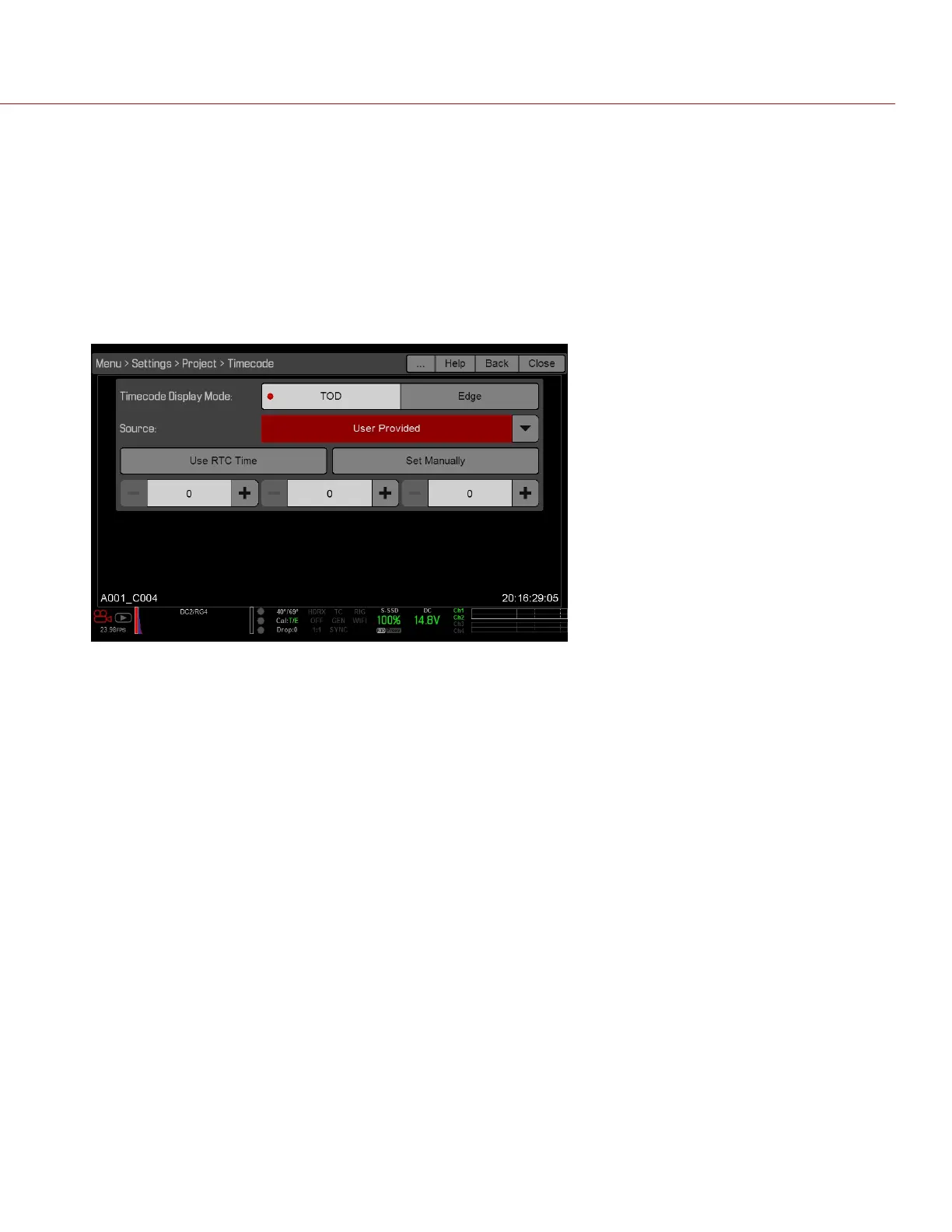 NOTE: A DSMC2 REDVOLT Expander is required to output timecode from the camera.