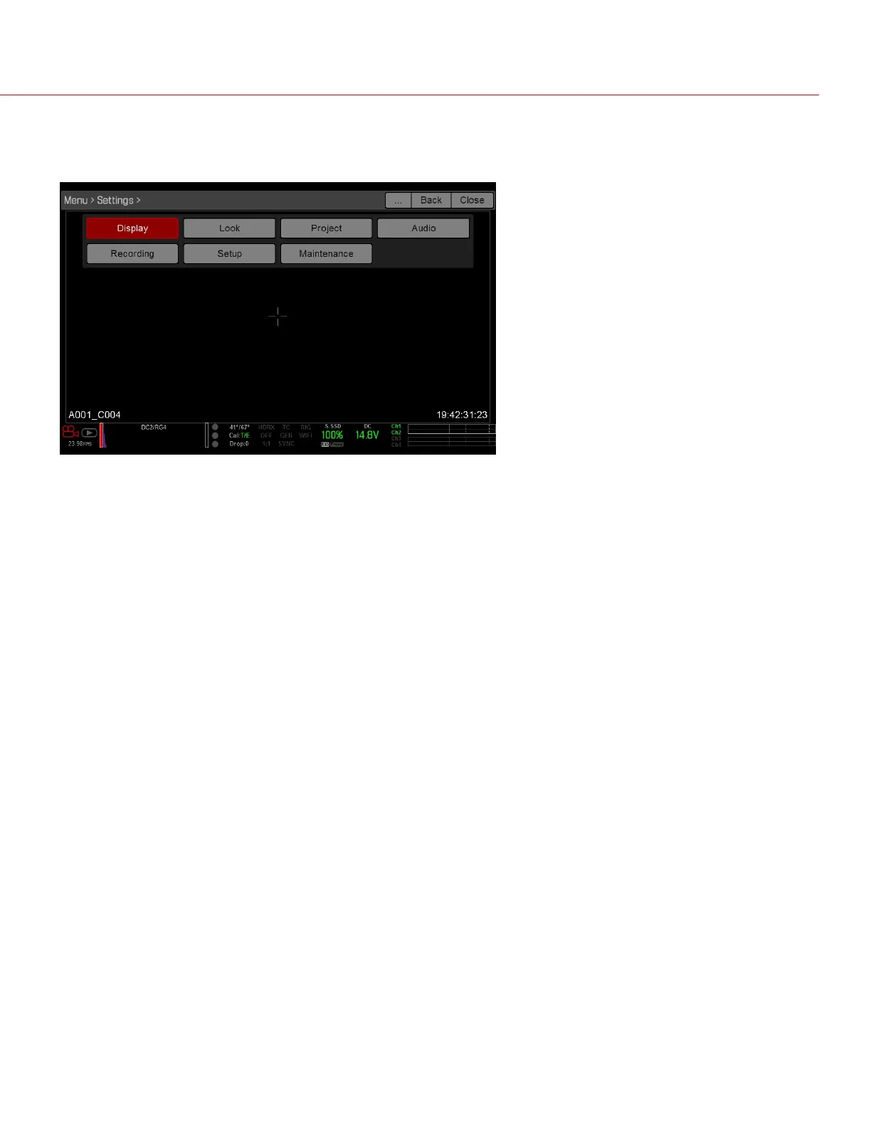 The Settings menu includes: Display, Look, Project, Audio, Recording, Setup, and Maintenance.