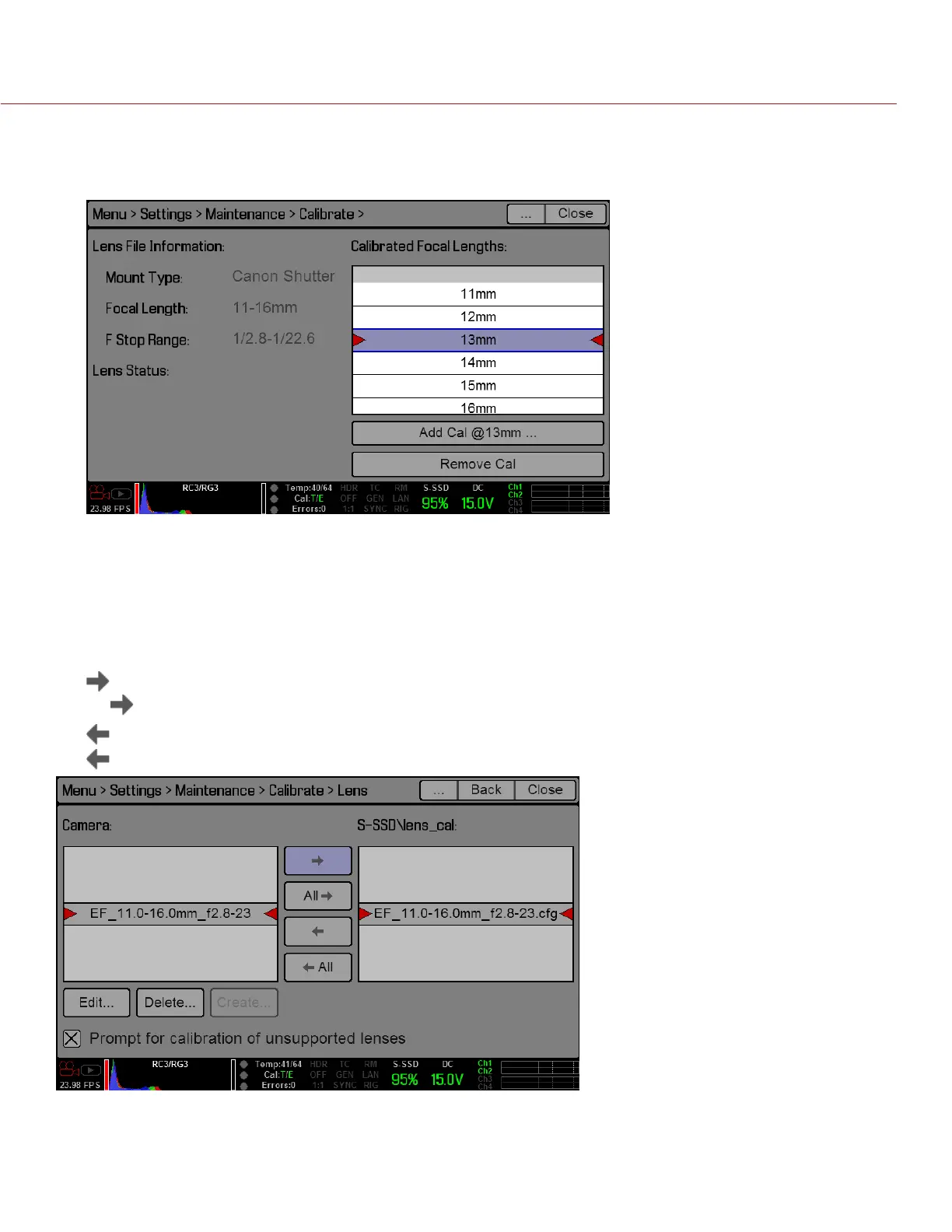 ‒ Remove Cal: Remove the calibration for the selected focal length.