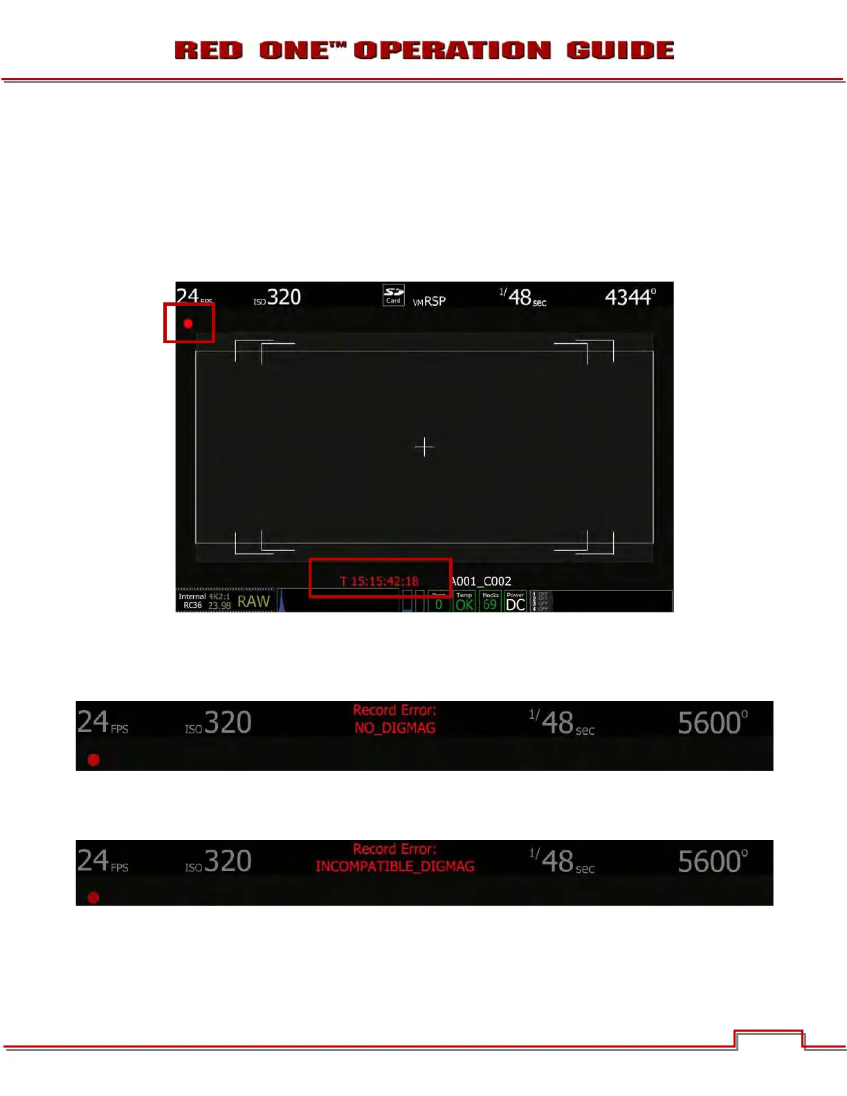 - A small red dot will appear in the top left corner of any video monitoring outputs (RED LCD, etc…)