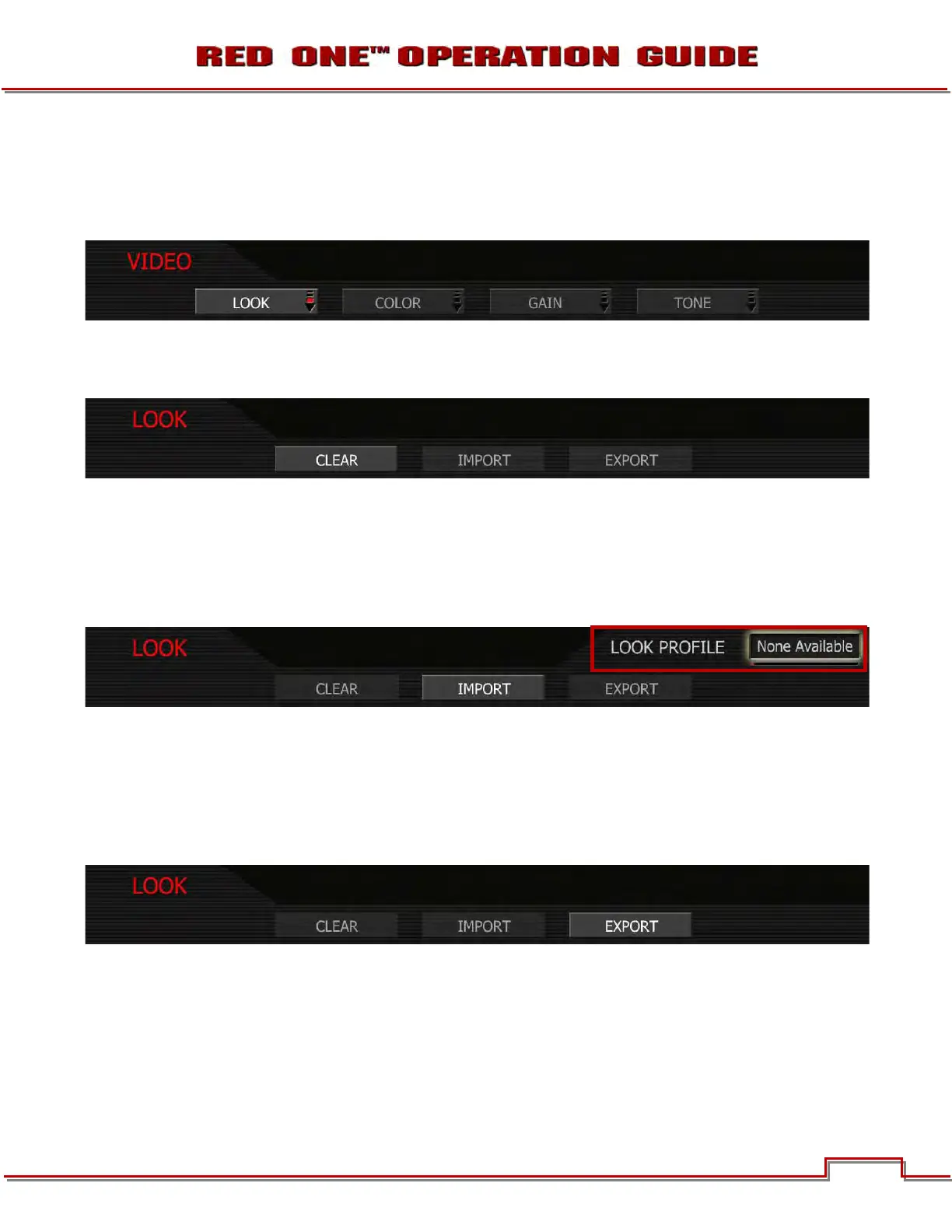 The LOOK menu permits Video, Gain and Tone values to be exported or imported from an SD Card. Look