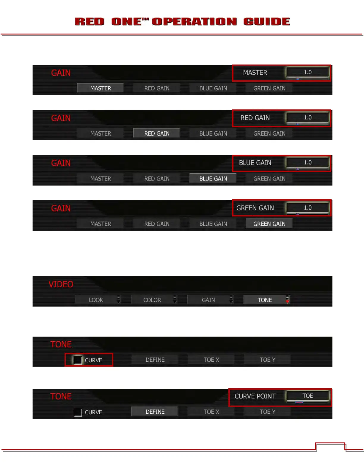 RED GAIN: Adjusts the gain of the RED channel only. Range is 0.0 (no Red) to +4.0.