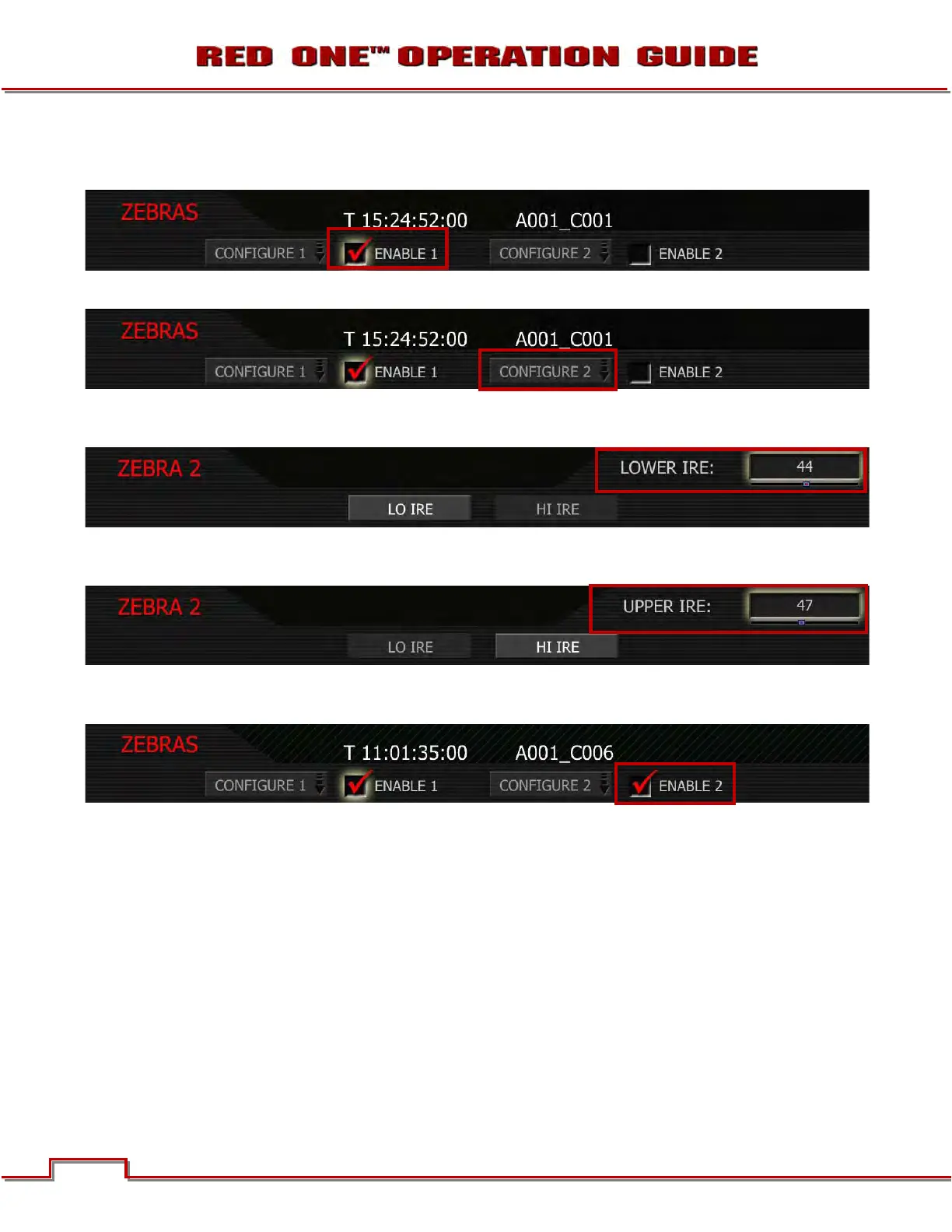 ZEBRA CONFIGURE 1: default settings are ENABLED with highlight indication set as LOW IRE: 101 / HI