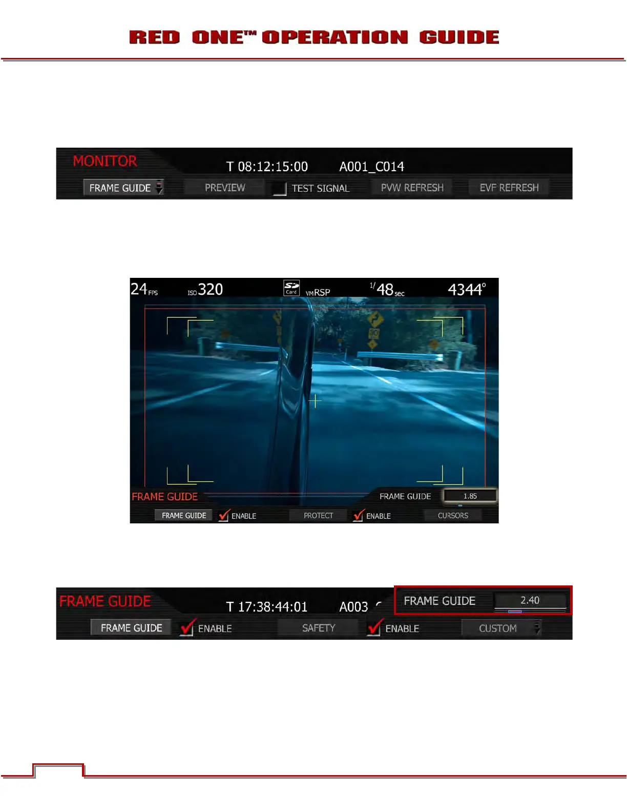2. FRAME GUIDE box will highlight to allow you to choose from FULL to 16:9. Default is 2.40.