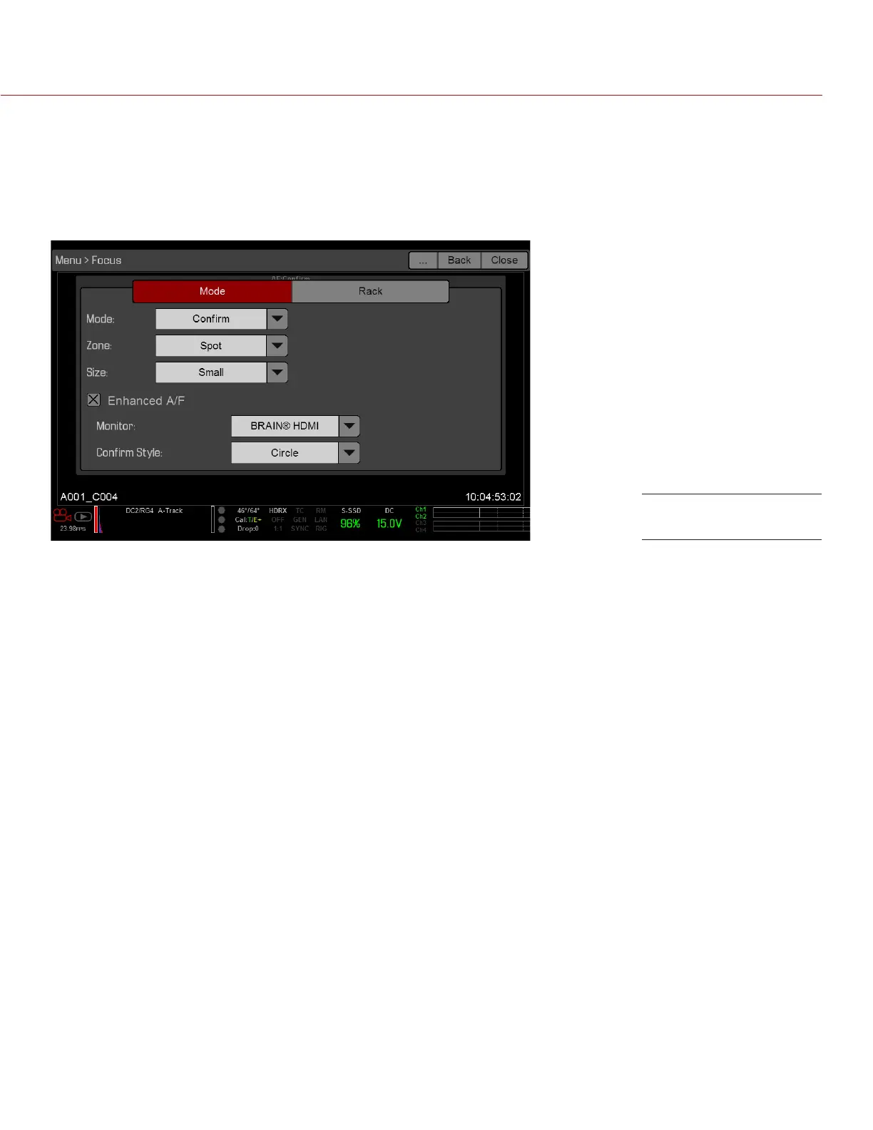 The Focus menu includes: Mode and Rack.