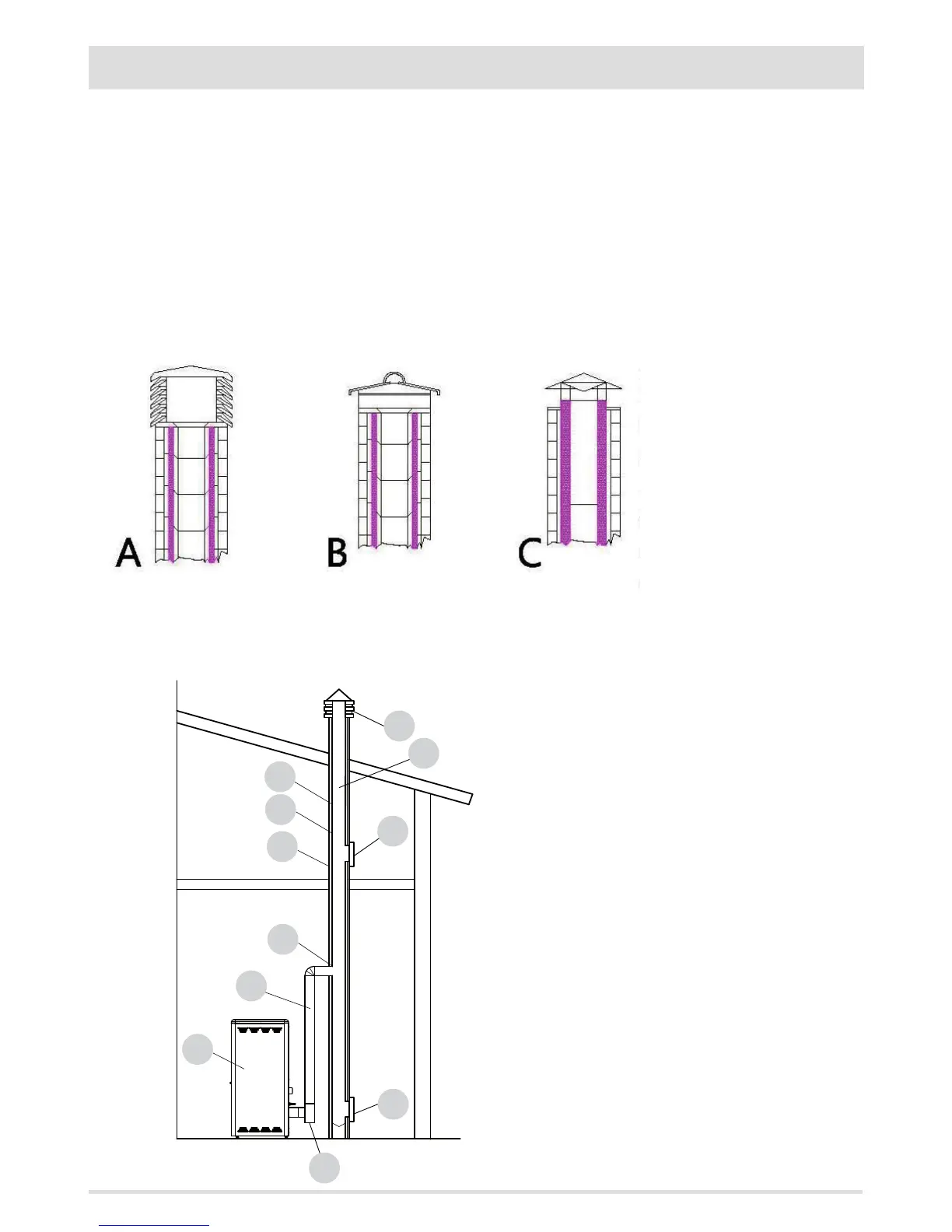 The chimney is a crucial element for the heating appliance to work properly: we recommend a wind proof chimney (A), see Figure 7.