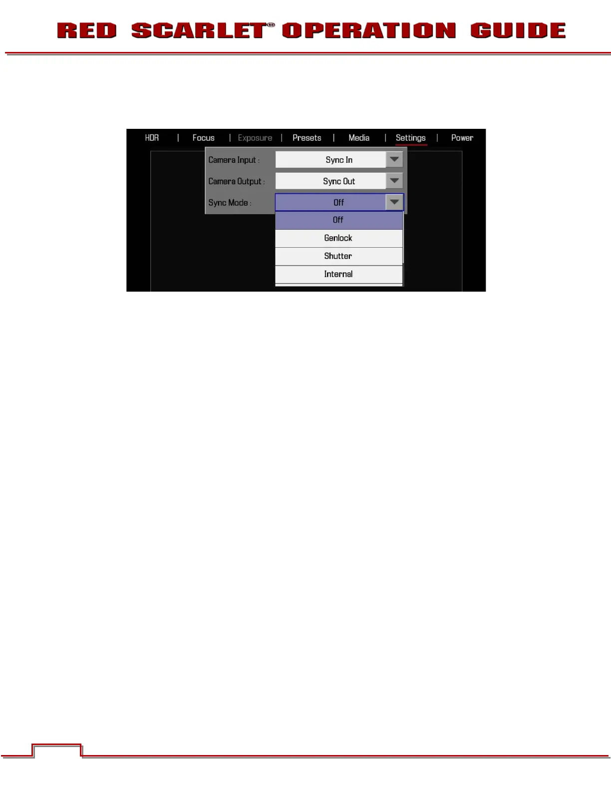 Available options are OFF, GENLOCK, SHUTTER, INTERNAL, PROXY, and SLAVE. Default is Off.
