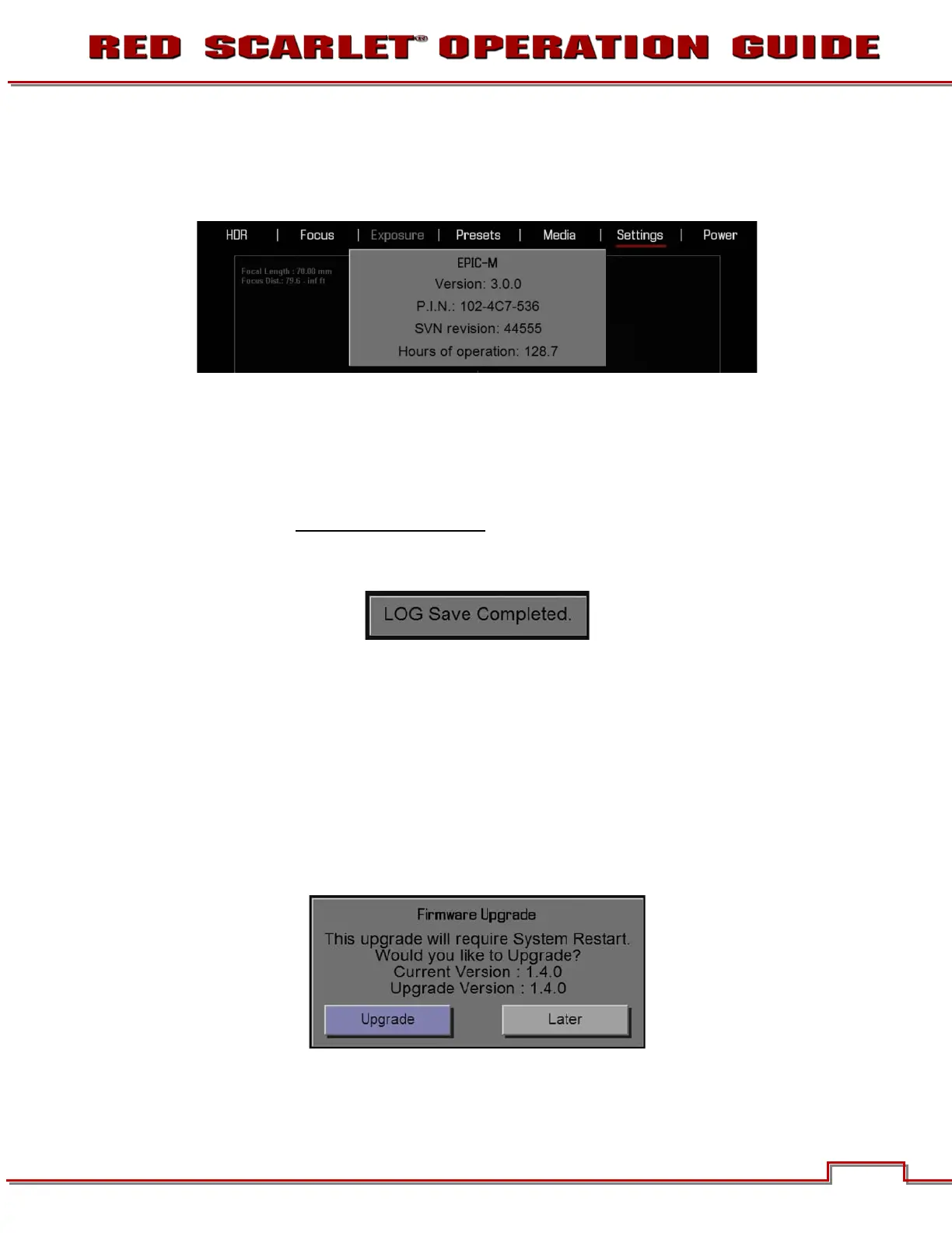 After successfully writing the log file to media, viewfinder output(s) will display LOG SAVE COMPLETED.