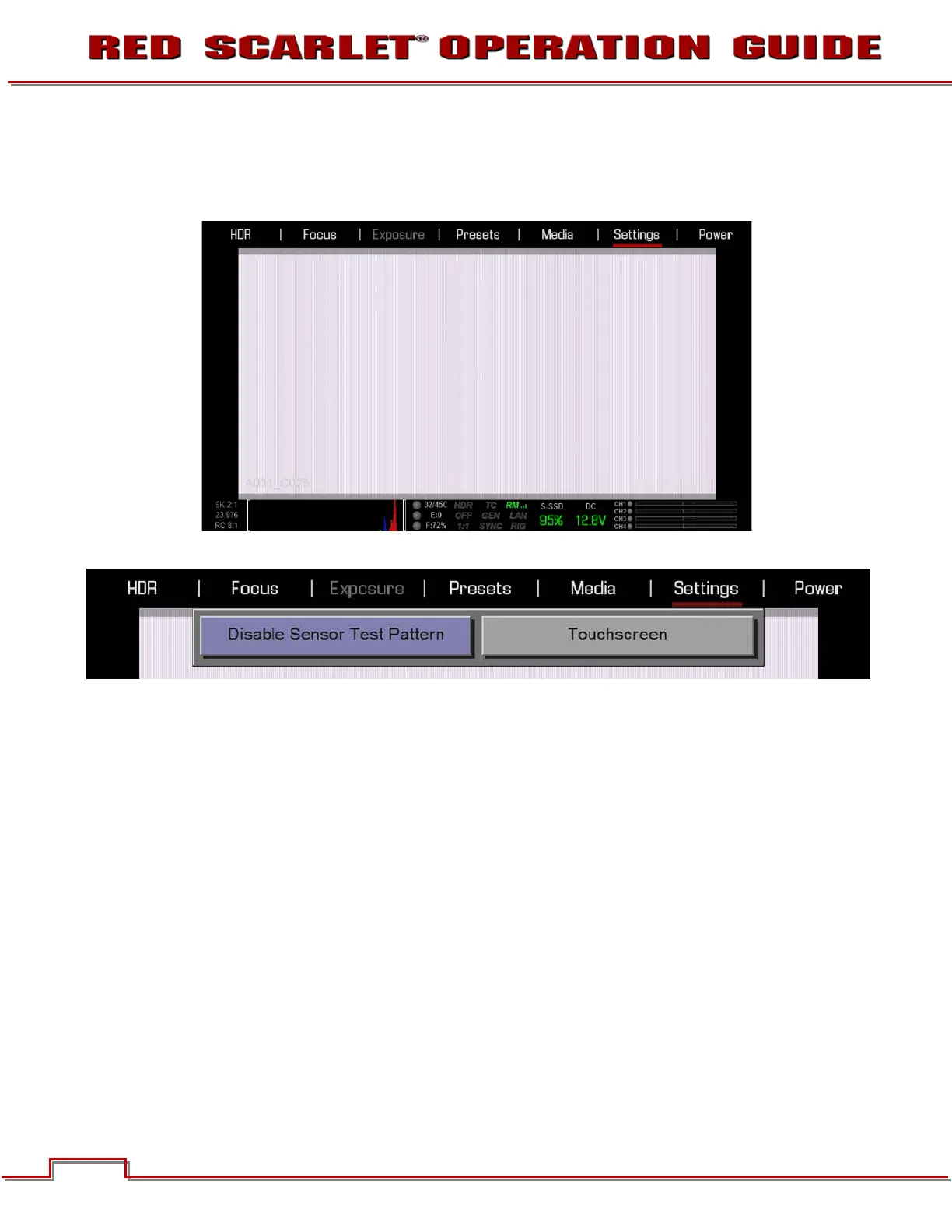 When selected enables / disables the sensor test pattern (White Screen). To turn on, select ENABLE