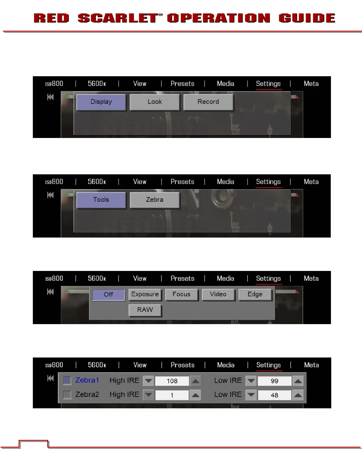 Allows you to toggle ON/OFF Zebras. Refer to SETTINGS MENU > DISPLAY > ZEBRA for complete