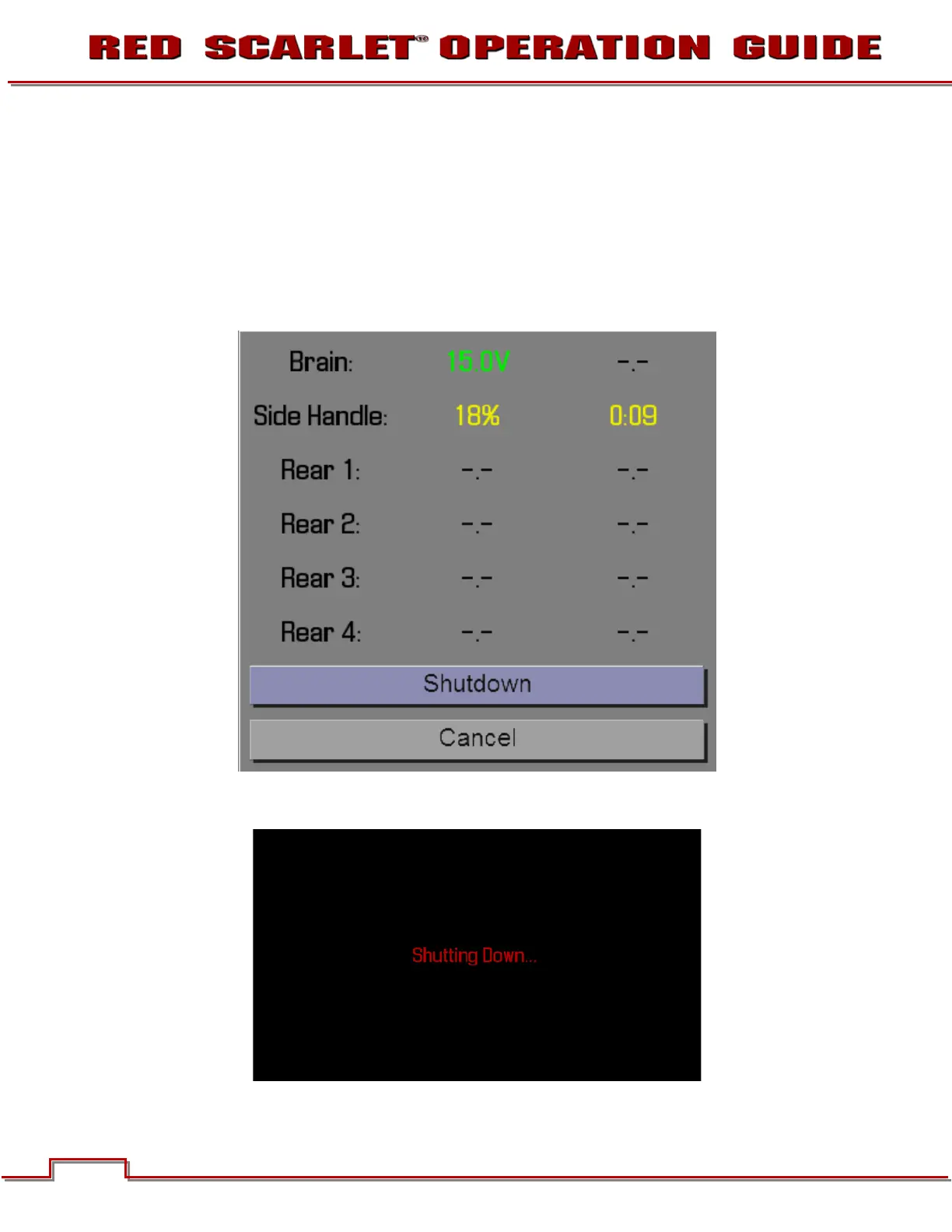 4. The camera will immediately power down displaying SHUTTING DOWN…. If a REDMOTE is